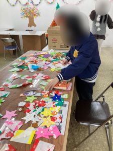 みなさんが可愛く折ってくれた飾りを1つ1つ壁に貼り付けました😊